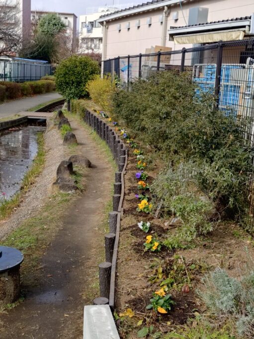 せせらぎの流れも見ることが出来る様になりました。心なしか滝への流入水量が増えた様に感じます。ふる里公園花壇は再度残った球根(名は判りませんが数種のミックス球根です)を植えています。横浜大輪蘭花園さん沿いの花壇内にはムスカリとチューリップの球根を植えました。